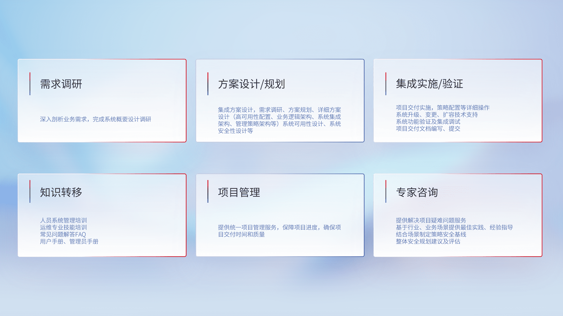 针对客户行业特性,,,,将宏观的安全战略和需求,,,通过专业的交付服务,,,实现项目落地,,,,为客户提供标准规范的集成交付服务。。